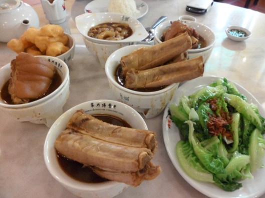 Bak Kut Teh (literally translated as Meat, Bone, Tea) – typical Hokkien dish, was actually created as sort of a fast food for miners back in the old days. It has all the ingredient for a good chinese meal. all in one kinda of concept. There’s the herbal soup which promotes good circulation, meat for protein, and rice for carb (strength). It was something that really took off as the miners found it filling, promotes health and quick to eat.  From there, BKT revolves until what it is today.