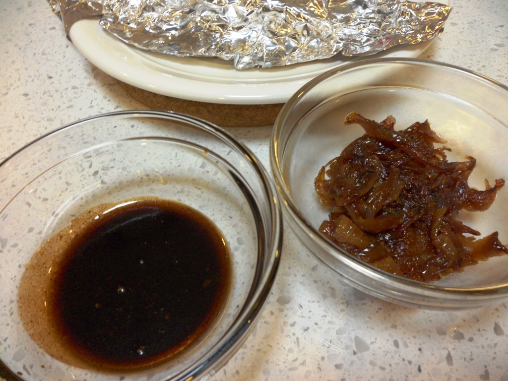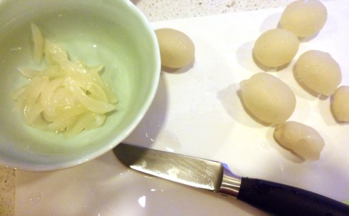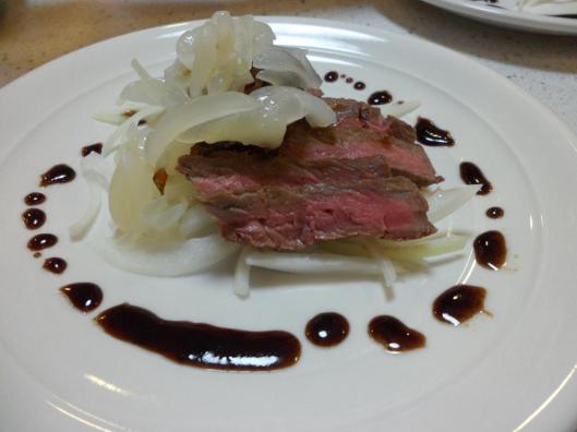I served this as an entrée. So, I pile the raw onions on the plate, follow by the caramelized onions. Then, I placed the sliced beef on top drizzled with the rambutan slices. Finish off with the sauce around the plate.