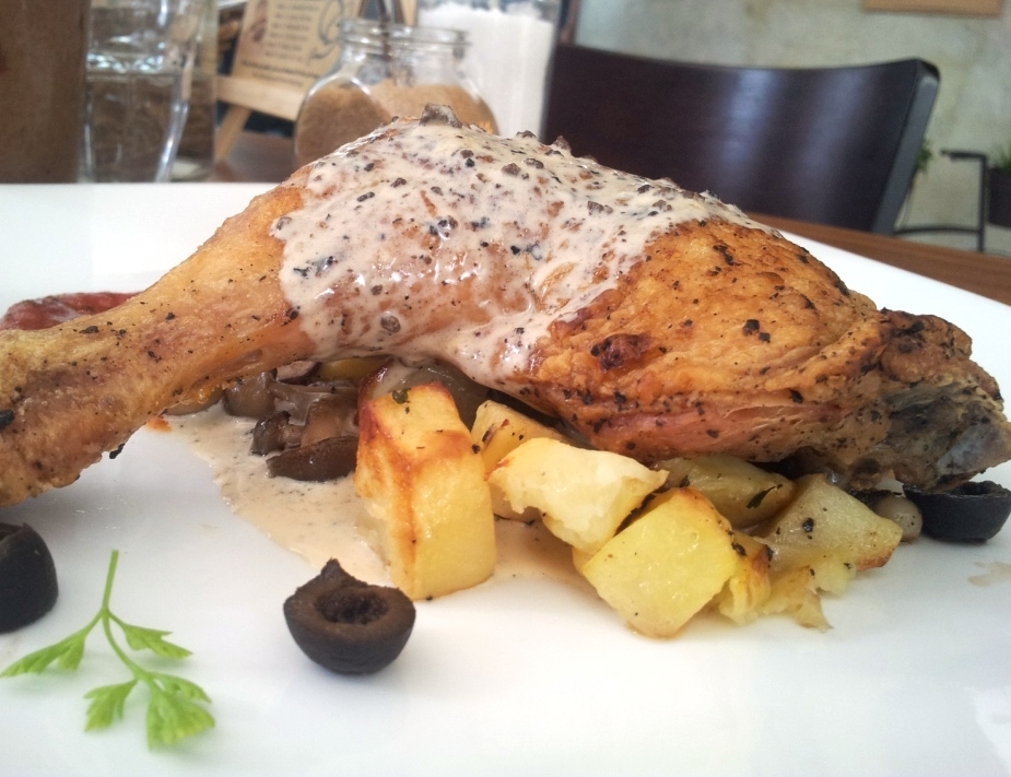 We patiently waited until lunch time to order the Fowl Luck (Roast chicken). Chicken was juicy and tender. Creamy mushroom sauce taste great with the hint of olives. Love it.