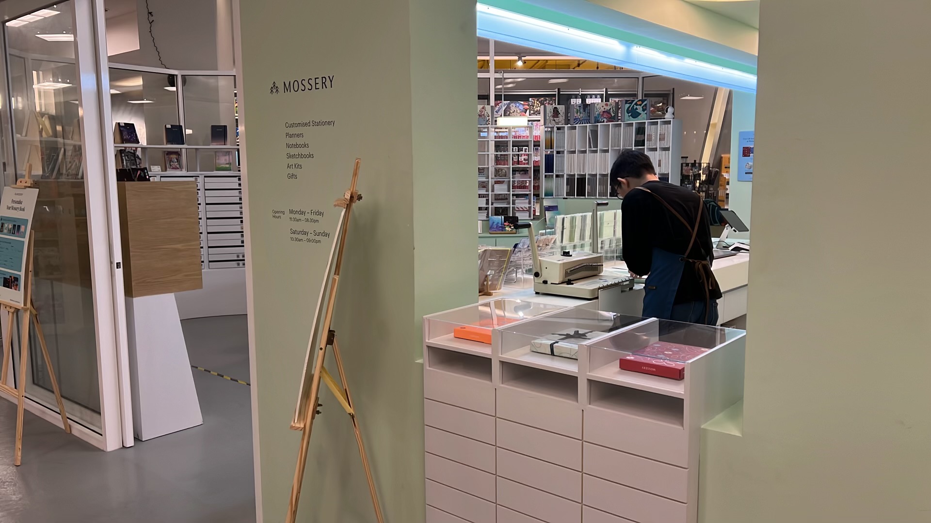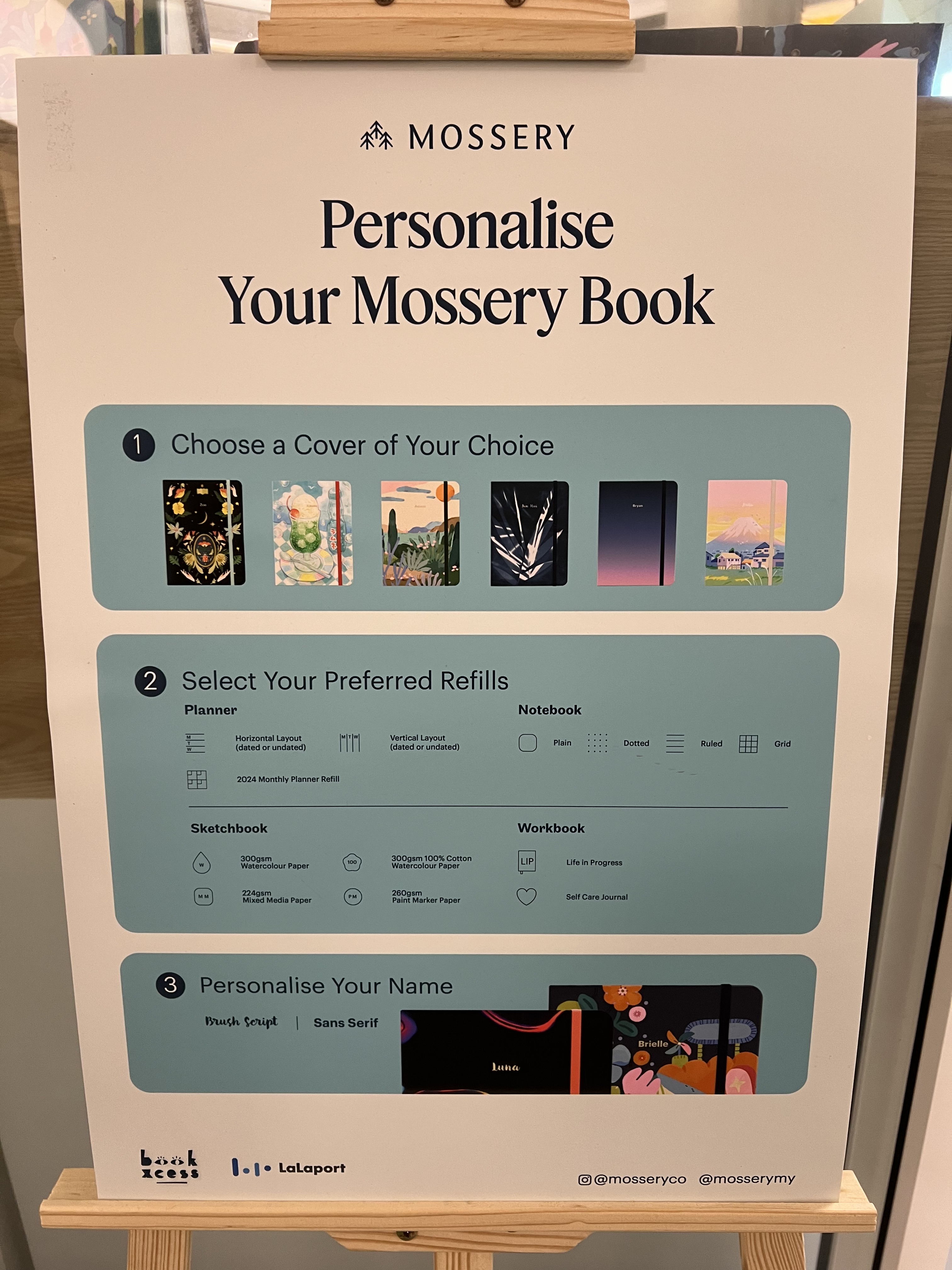 Today I went exploring in Lalaport. Found an interesting-looking bookxcess. Went exploring inside it – You know, typical things you do when you see an interesting shop. Guess what I found? A little shop called Mossery that let me create my own personalised notebook, that’s what I found.