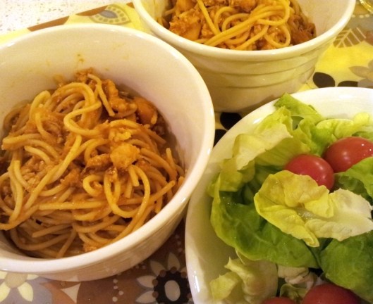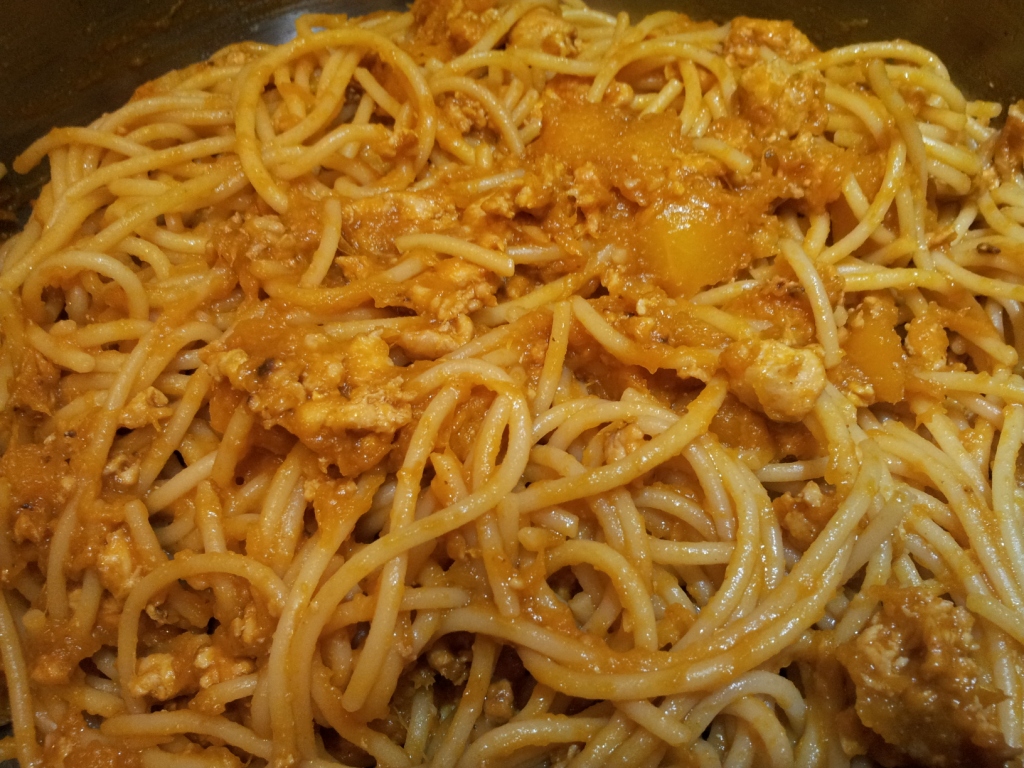 In the same pot, I add olive oil and the chopped garlic. Throw in the tomato paste and mince chicken. Fry till cook. Throw in the roasted pumpkin. Add half cup of water. Give it a good stir and then simmer for about 5 minutes. Add the Spag in and stir well. Off the fire and allow the pasta to sit in the hot pot for about 5-10 minutes before serving. (I find that this allows the mild sweetness of the pumpkin to soak into the spag)